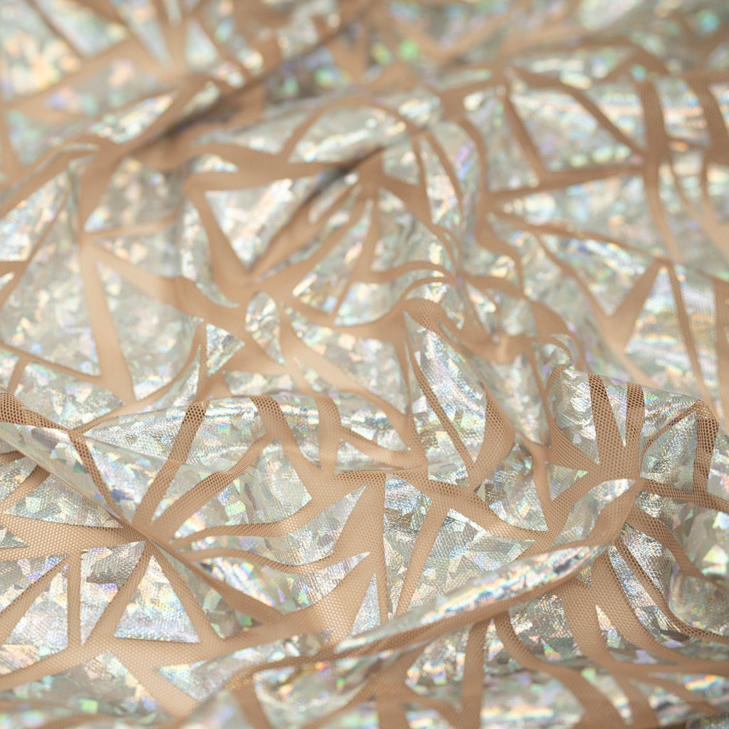 Abstract Triangle is a 4-way stretch Polyester Mesh with shattered glass foil. This fabric is excellent for dancewear and performance costumes. It's lightweight and breathable, making it perfect for dancewear that needs to have maximum movement and flexibility. It's easy to care for and offers bold, eye-catching details that will take any performance costume to the next level. This fabric is durable and long-lasting, so you can trust that your performance costume will stand up to the rigors of both practice and performance.