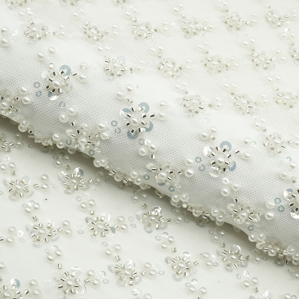 Blossom Beaded with Sequin fabric is a luxurious and eye-catching material that combines the elegance of beads with the sparkle of sequins, forming diamond patterns. This versatile fabric is perfect for creating stunning garments and accessories. The intricate beadwork and sequin embellishments add a touch of glamour and sophistication, making it ideal for formal wear, dancewear, and special occasion attire.