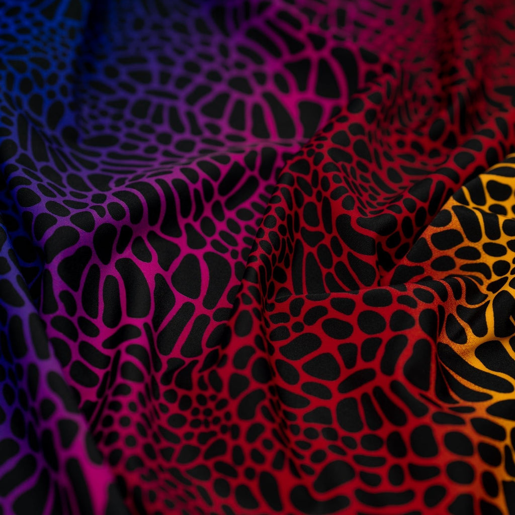 Multicolor Safari Spots Printed Spandex Fabric is manufactured using high-quality 4-way stretch nylon spandex fabric. This textile was created using a Direct to Ground Digital Printing method allowing the dye to fully saturate into the material achieving vibrant colors and full coverage as you stretch. This fabric can be stretched in all directions and has great recovery as a result of the high spandex content. Specifically engineered for Swimwear, Dancewear, Activewear, and Cosplay. This long-lasting fabric is perfect for creating high-quality, vibrant projects that you'll be proud to wear and show off. This fabric is lightweight and versatile, perfect for any creative endeavor that values superior quality and long-lasting results. It's sure to become your go-to material for any project you choose to make.
