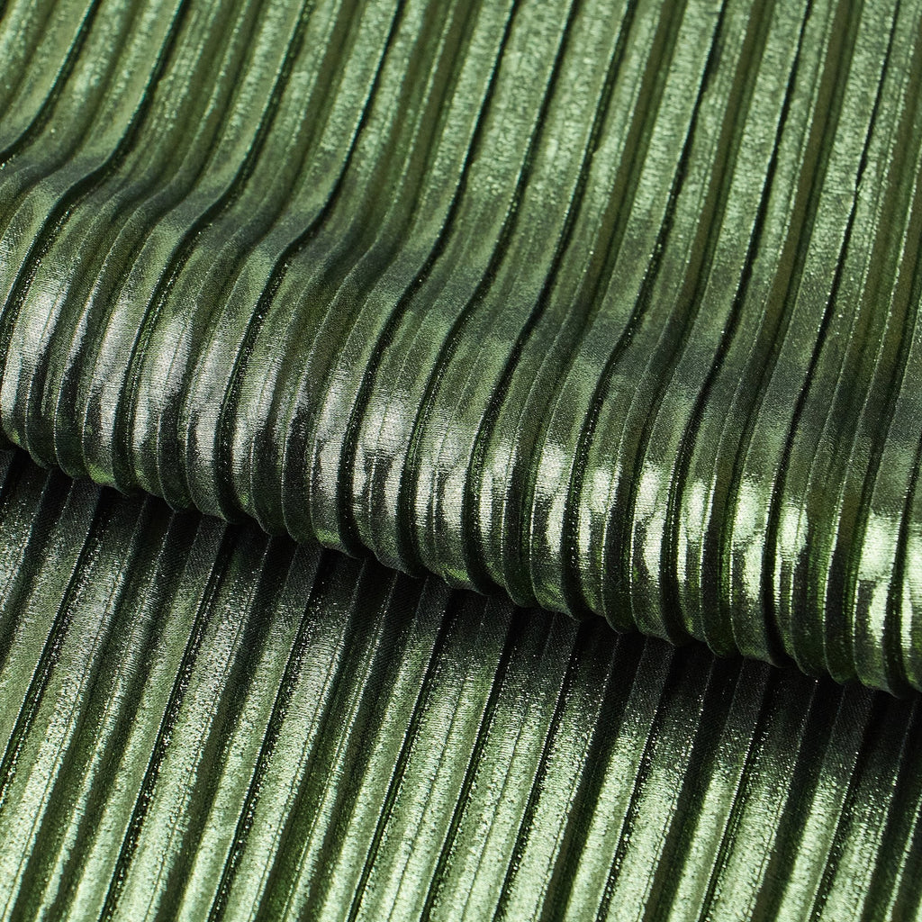 Unleash your inner fashionista with our Titanium Pleated Polyester Fabric! This stunning fabric is a game changer for all you couture lovers out there. Made of exquisite foil covered pleated polyester, it is designed to stretch in the direction of the folds, making it incredibly versatile and perfect for creating iconic statement pieces. Sleek, elegant and absolutely captivating, our Titanium Pleated Polyester Fabric feels luxurious to the touch and exudes pure sophistication. The high-quality material ensures it drapes beautifully, giving your designs a flowy and ethereal vibe. Whether you want to create a chic gown or a show-stopping top, this fabric is guaranteed to elevate your designs to the next level. It's perfect for adding texture and movement to your creations, and will undoubtedly turn heads everywhere you go. Get ready to unleash your creativity and make a statement with our Titanium Pleated Polyester Fabric. It's time to let your imagination run wild and create something truly extraordinary
