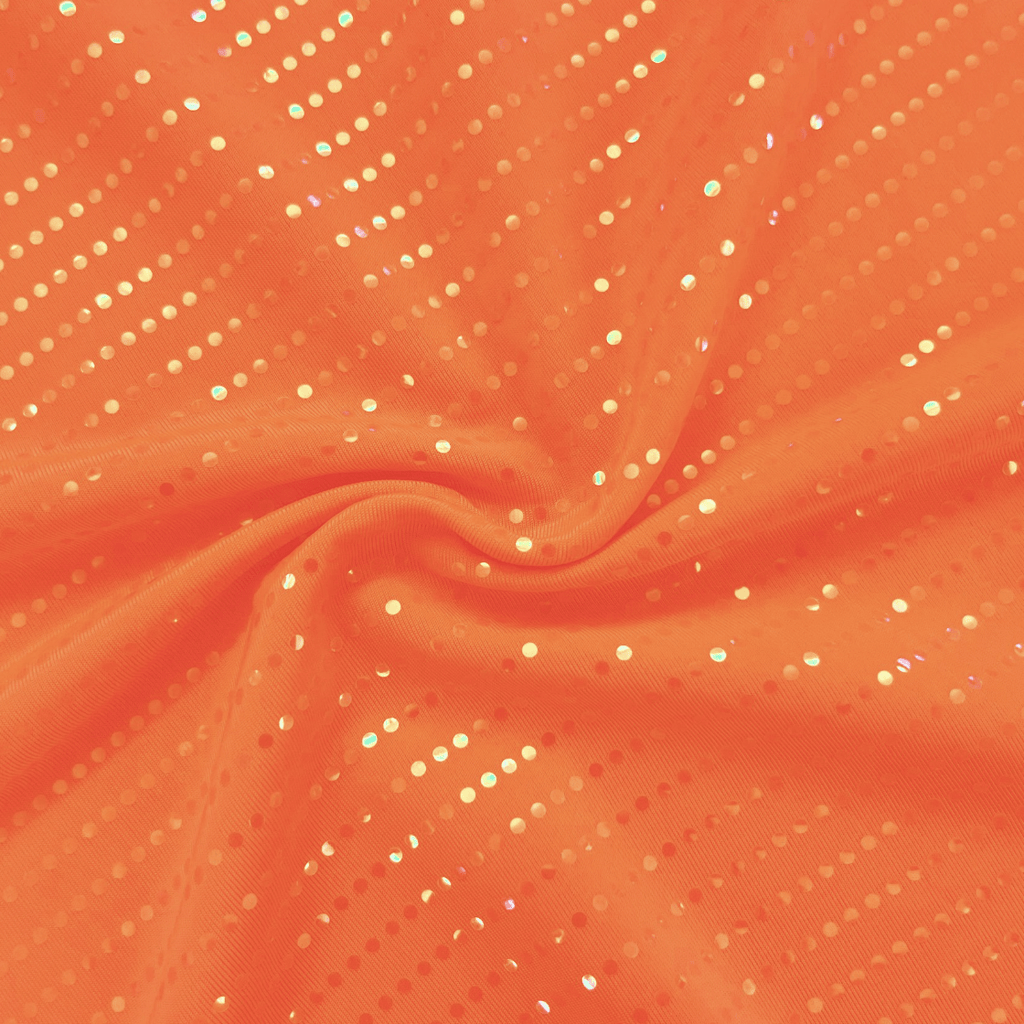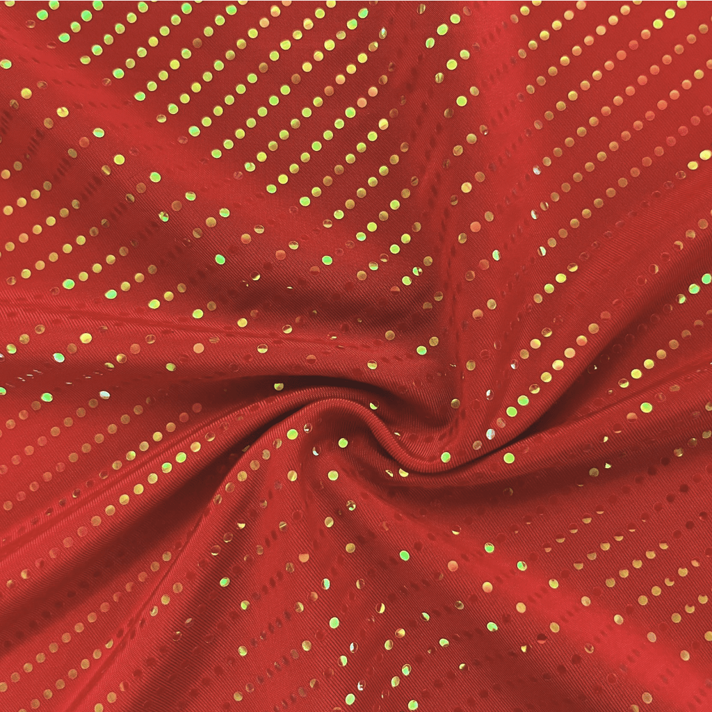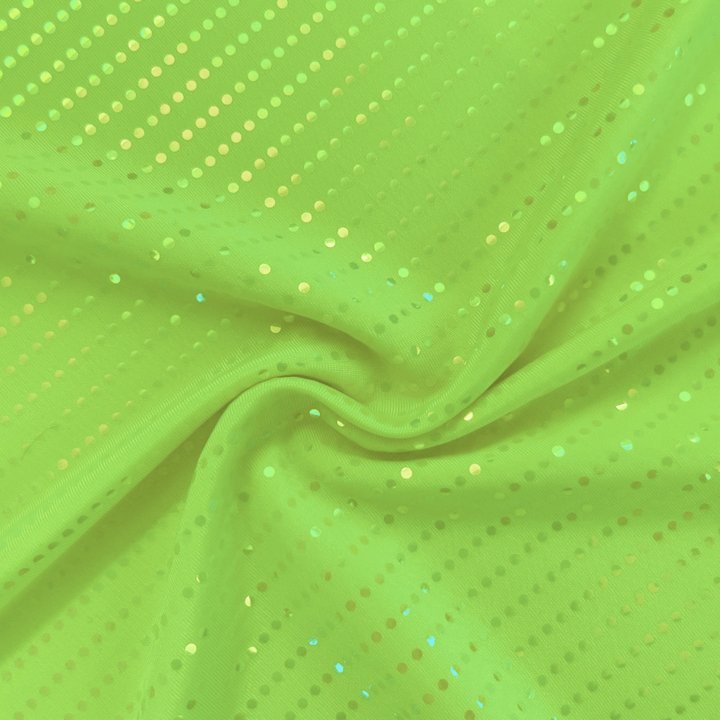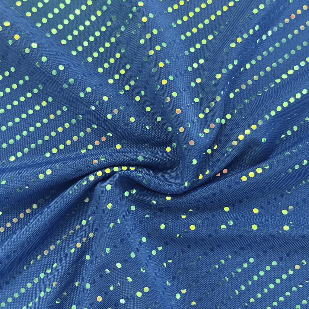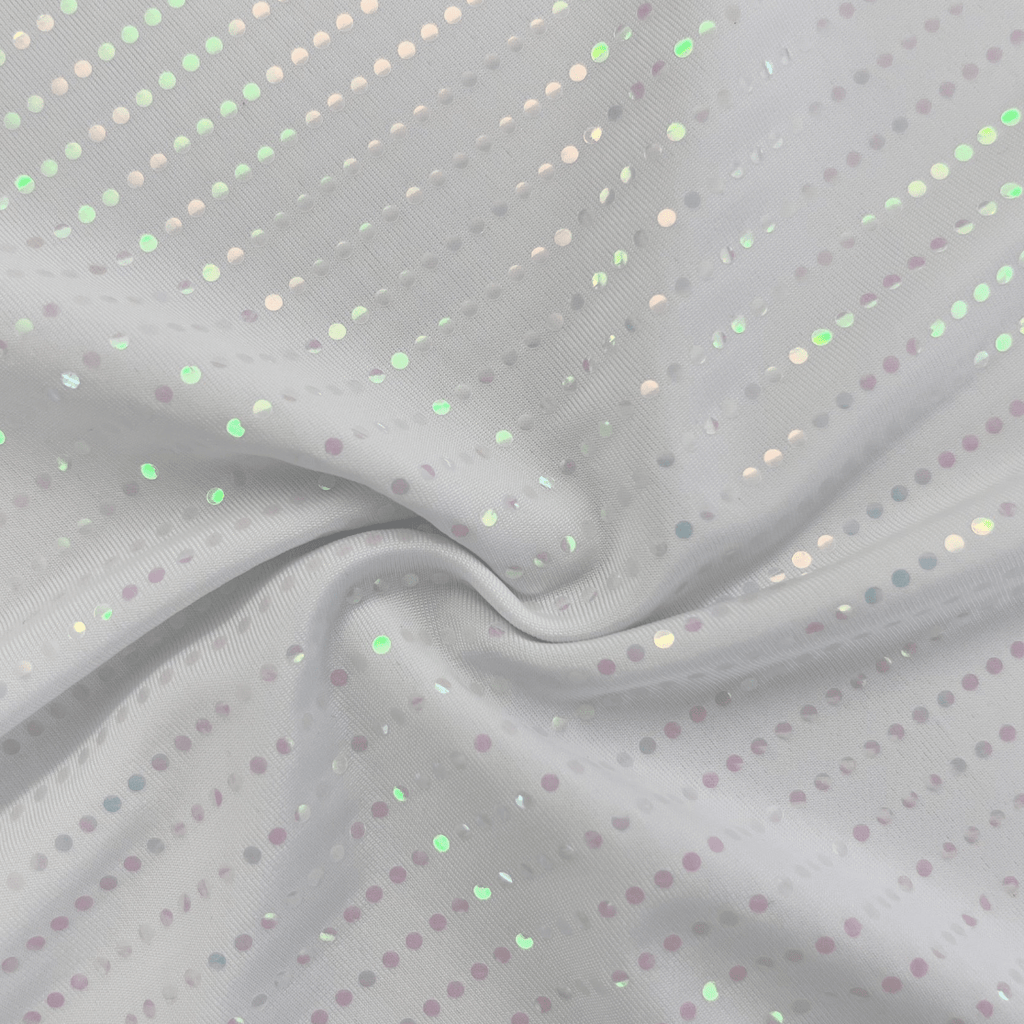 The Waterfall On Polyester Spandex is a highly stretchable fabric, composed of 92% Polyester, 8% Spandex with a weight of 205 gsm, features a striking visual texture created by iridescent transfer sequin dots arranged in parallel lines across its spandex base. The 4-way stretch make this material exceptionally versatile for apparel, particularly dancewear, ice skating costumes, and stage outfits where flexibility and a dynamic appearance are essential. The iridescent quality of the dots catches the light, adding a shimmering effect to any garment made from this unique fabric.
