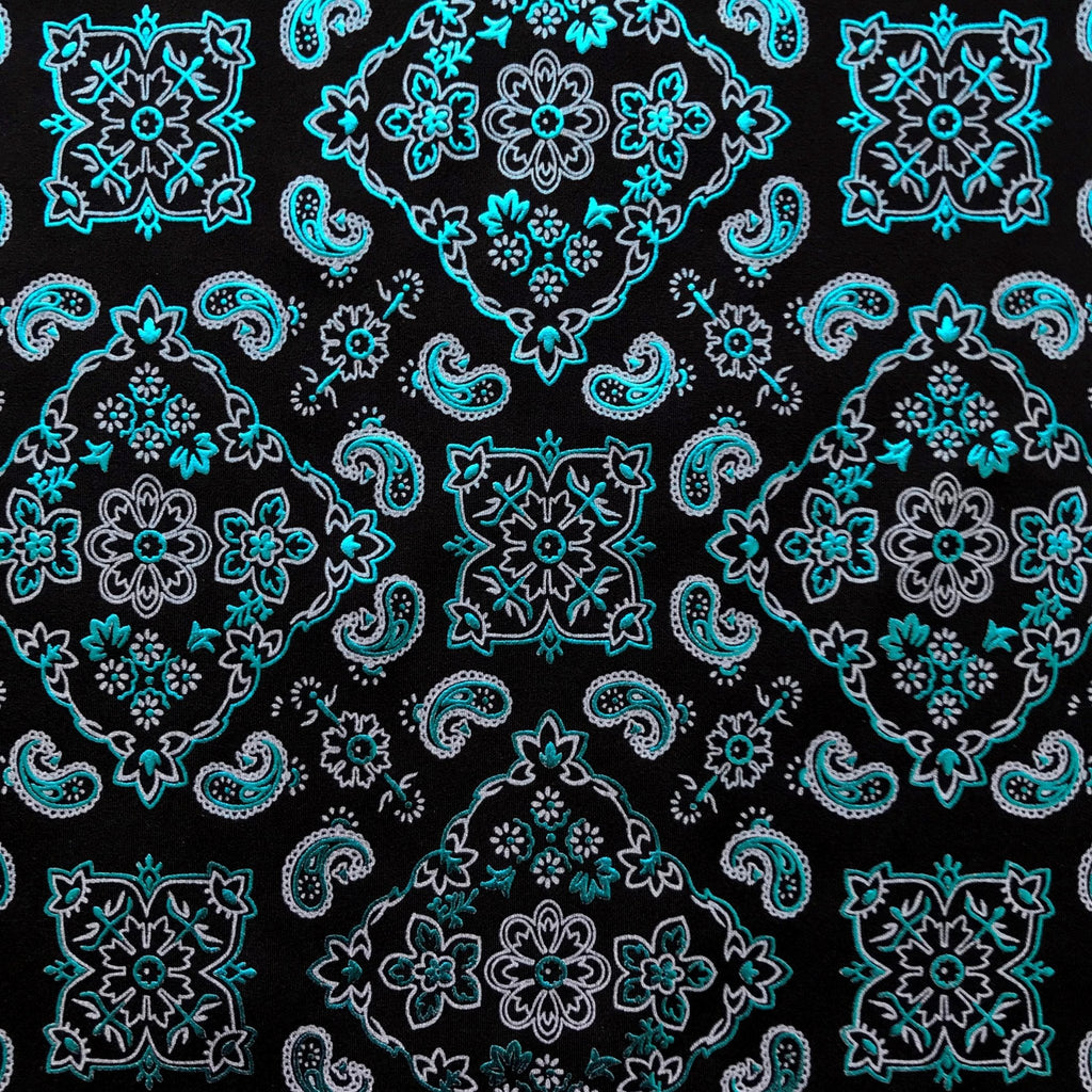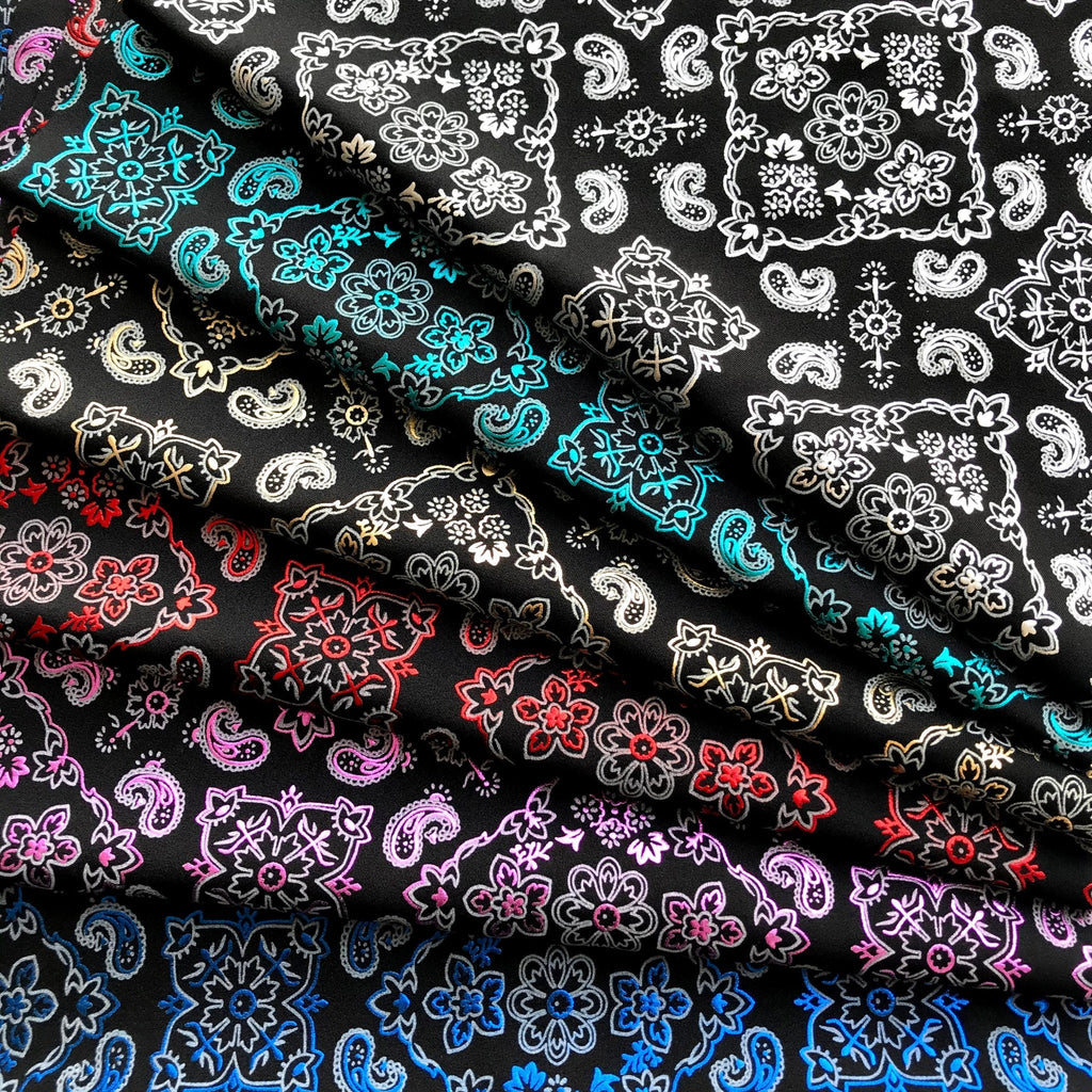 Bandana Foil Printed Spandex Fabric is manufactured using high-quality 4-way stretch nylon spandex fabric. This textile was created using a Bandana Paisley Foil Pattern printed over a Solid Spandex allowing us to create this Funky and Cool spandex. This fabric can be stretched in all directions without foil cracking and has great recovery as a result of the high spandex content. Specifically engineered for Dancewear, Performance and Cosplay. This fabric is lightweight and breathable, perfect for a day spent outdoors. It's also durable and designed to last, so you can be sure you'll get your money's worth.