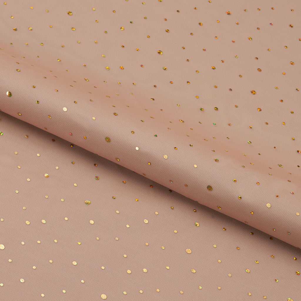 Tula Power Mesh features transferred metallic dots, creating a shimmering effect ideal for performance and athletic apparel. It's a unique and eye-catching way to bring style and energy to any ensemble.